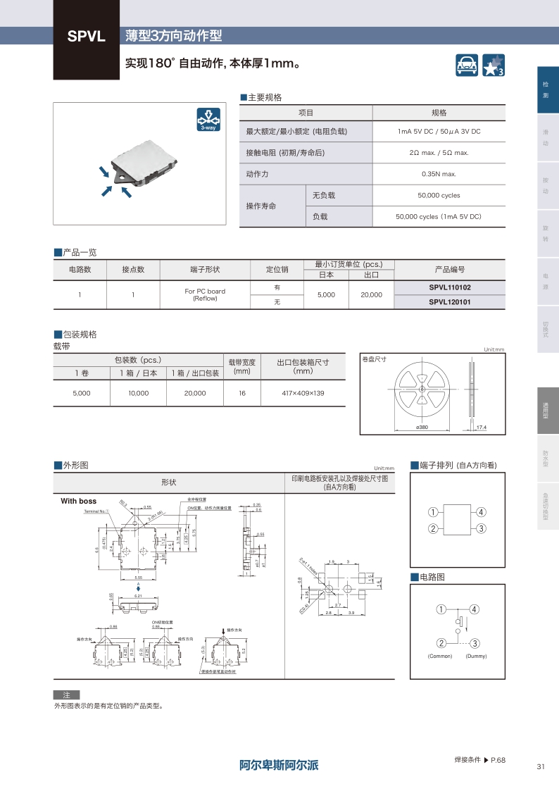 臥式 / 薄型多方向動作型 ? 最大額定值:1mA 5V DC ? 動作力:0.35N max. ? 操作壽命(無負載):50000 cycles。