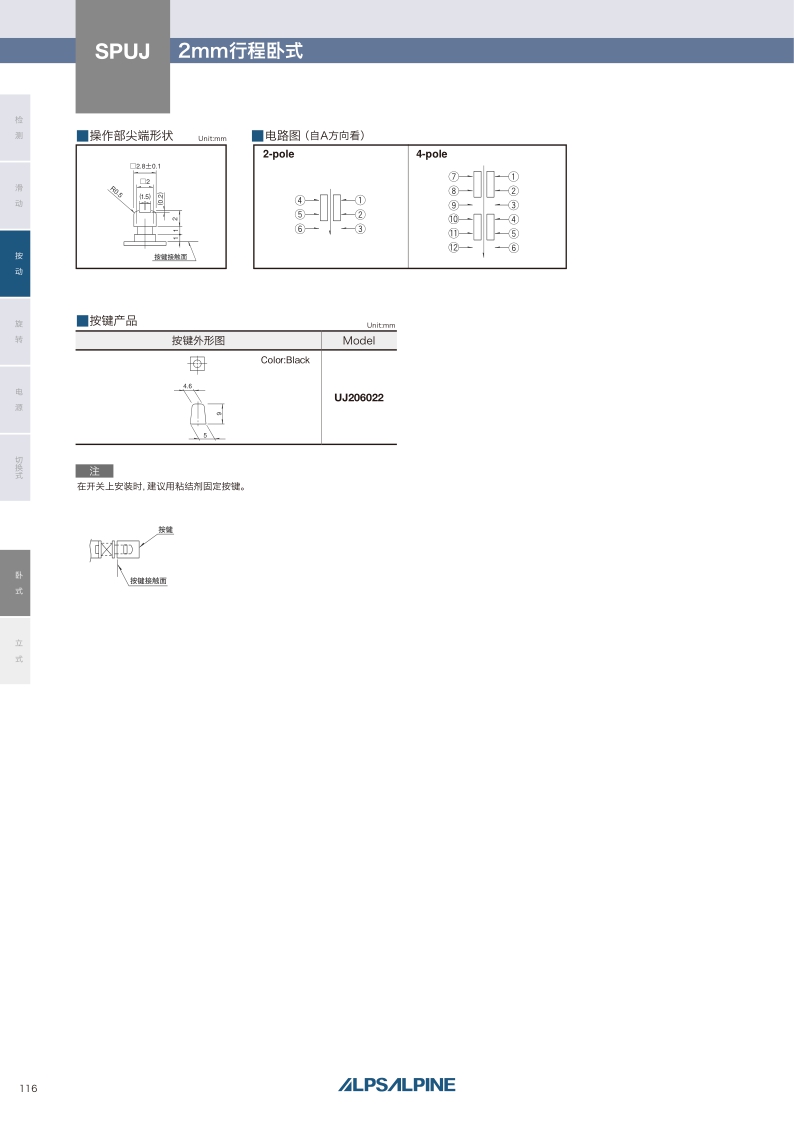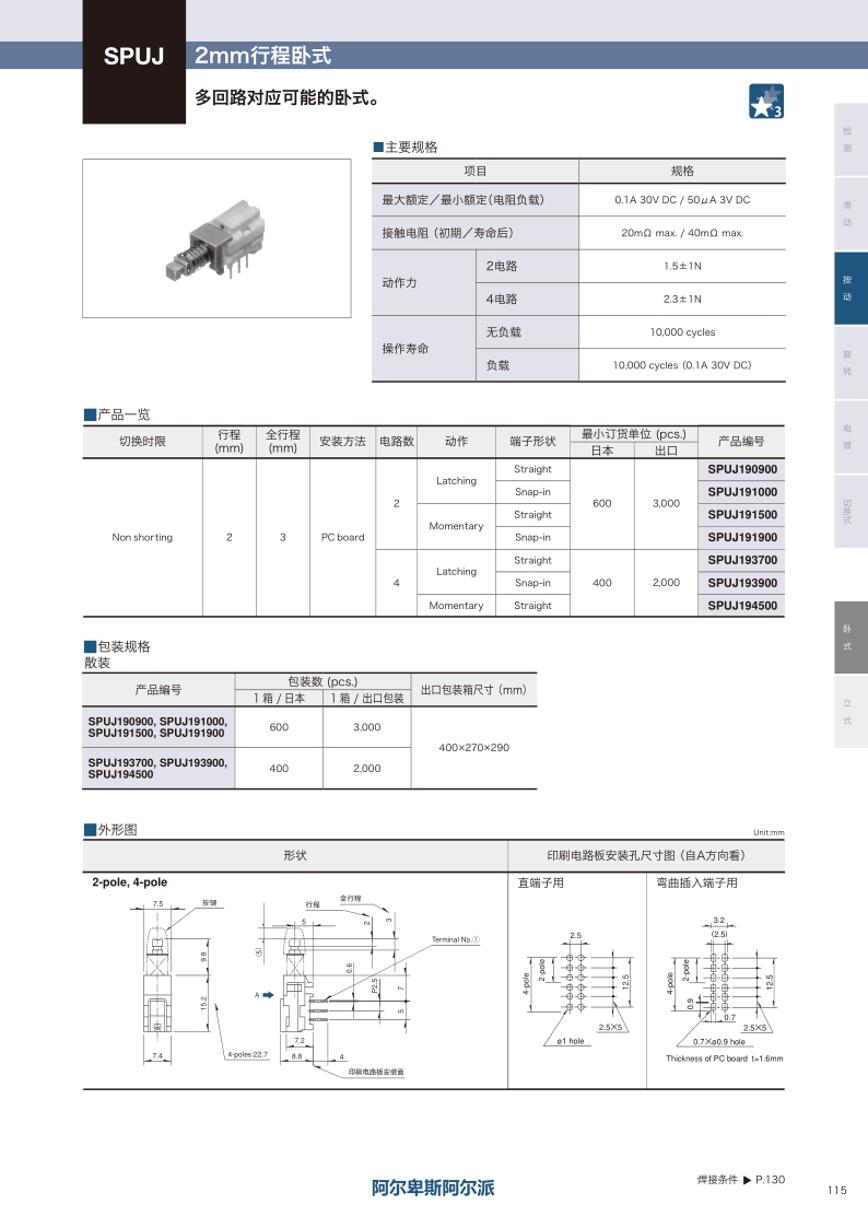 多回路對(duì)應(yīng)可能的臥式,操作方向:Horizontal ? 最大額定值:0.1A 30V DC ? 行程:2.0mm ? 電路數(shù):2/4-pole。