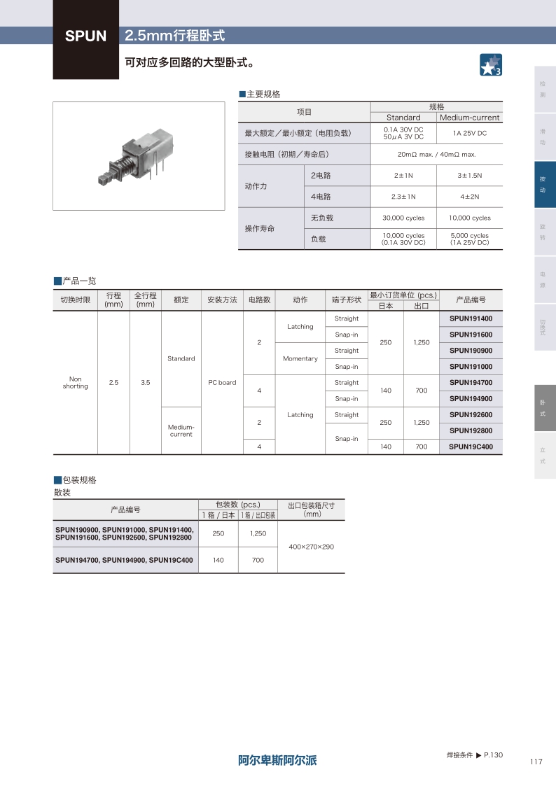 可對應多回路的大型臥式?操作方向:Horizontal ? 最大額定值:0.1A 30V DC (Standard) 1A 25V DC (Midium-current) ? 行程:2.5mm ? 電路數:2/4-pole。