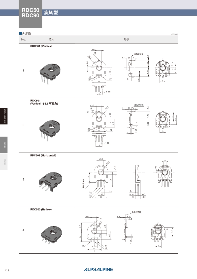 RDC9010006 照片 Vertical Reflow(長壽命) 3.3kΩ 80° 60° ±3% φ3.5 10,000,000 cycles 5V DC 11.0×13.7×3.2mm