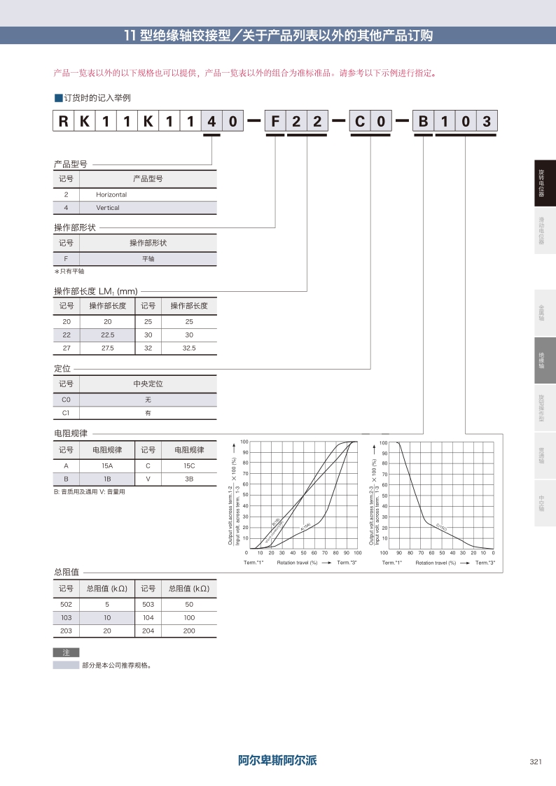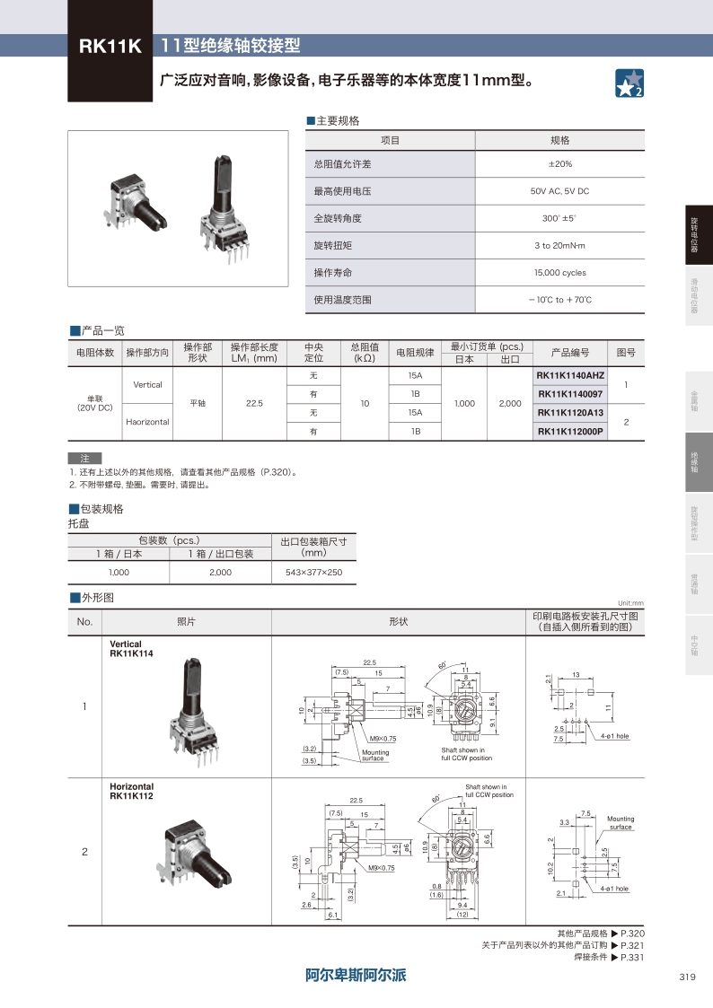RK11K系列廣泛應對音響,影像設備,電子樂器等的本體寬度11mm型。型:絕緣軸鉸接 ? 外形尺寸:11型 ? 電阻體數:單聯 ? 附屬開關:無。
