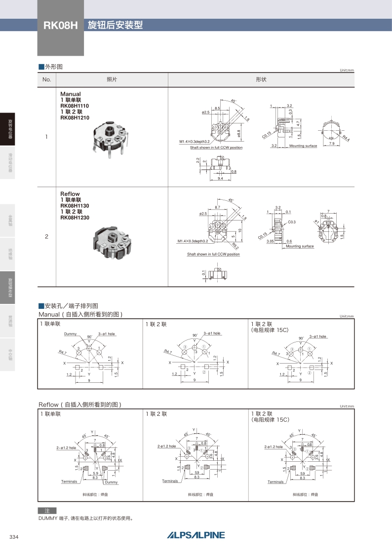 RK08H系列適合于調整音質,音量的小型狀型。型:旋鈕后安裝 ? 外形尺寸:8型 ? 電阻體數:單聯,2聯 ? 附屬開關:無。