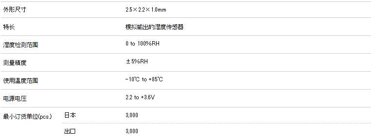 小型濕度傳感器(SMD)HSHCA系列小型封裝,測量精確,最大濕度測量范圍達到100%。型:表面貼裝 ? 安裝方法:表面貼裝。