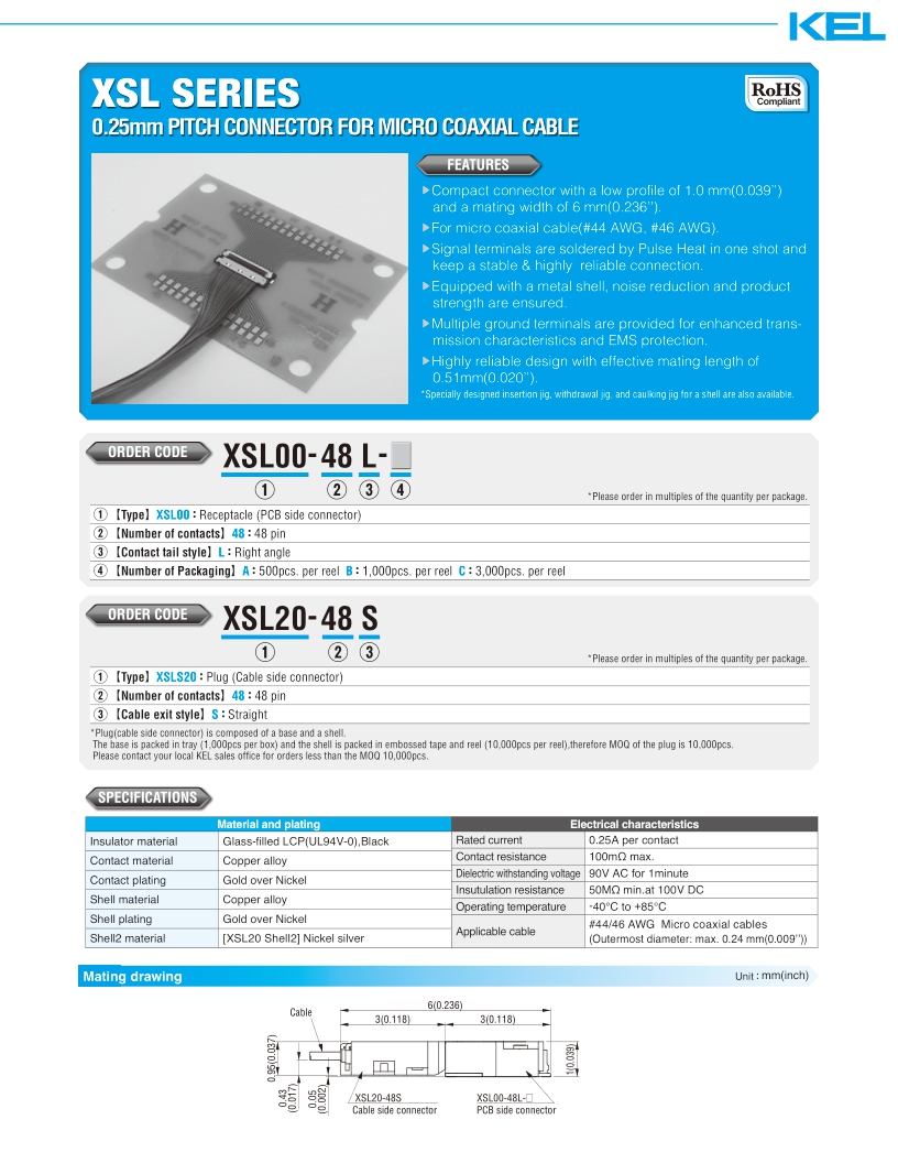 KEL極細同軸電纜連接器產品“XSL系列”是用于0.25毫米螺距微同軸線纜,XSL00-48L業界最低的產品的水平的連接器。用于微同軸線纜0.25毫米間距用連接器,AWG#4446,插座(基板側連接器),直角型,48個磁極,裝箱數3000。