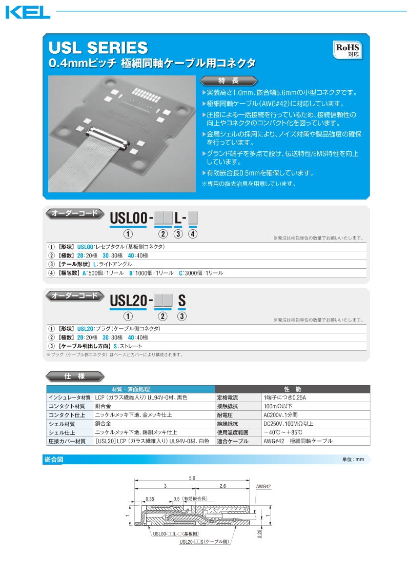 KEL線對板連接器,USL系列極細同軸電纜。“USL系列”是用于微同軸電纜(AWG#42)的0.4 mm間距絕緣位移連接器,USL系列超細同軸電纜用0.4mm間距IDC連接器,線對板連接器插座,直角,極數有20、30、40,包裝數量有500、1000、5000。主要用于照相機、攝像機、DV機、無人機等圖像傳輸、數據傳輸等。