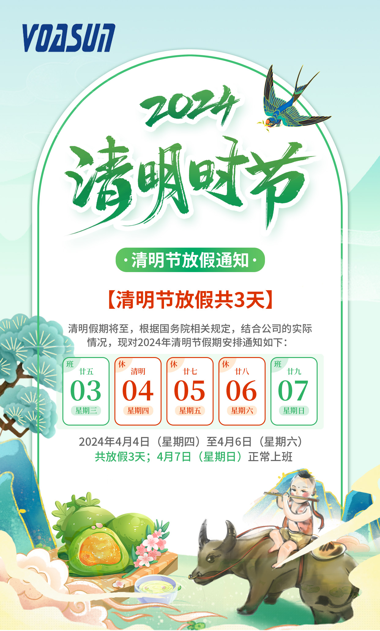 根據(jù)國家及公司相關(guān)規(guī)定,2024年清明節(jié)放假及調(diào)班安排:4月4日、5日、6日放假,共3天;4月7日(周日)上班。